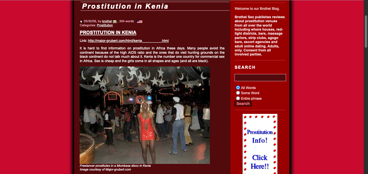 Read what the well established brothel blog writes about sex and prostitution in Kenya. Poverty and sensuality mix for the advantage of hardened sex travelers. It's raunchy and rude with hardened professional hookers who work out of watering holes and Mombasa discos as freelance sex workers for short love affairs by the shot.