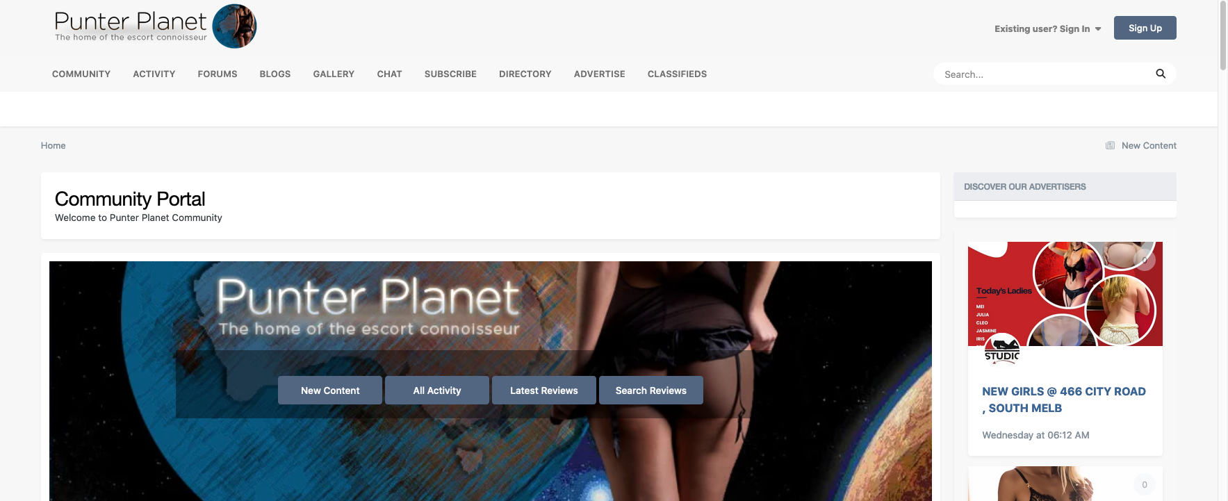 Active escort and brothel review forum from Downunder. Punter Planet is organized similar to other regional boards. It contains active discussions and showcases various service providers (paid advertising). Posts and Forums should be the most frequently visited items in Planet's top navigation bar. It's design shows sophistication by being user-friendly and professionally looking.