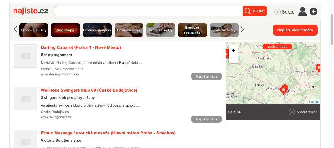 Centrum.cz is another big online directory providing reliable links to Czech erotica including Brono porn, Praha escorts and swinger sites. Categories of sexual services are listed on top of page with individual links grouped on bottom. Easy to find eroticke-sluzby as that is the Czech