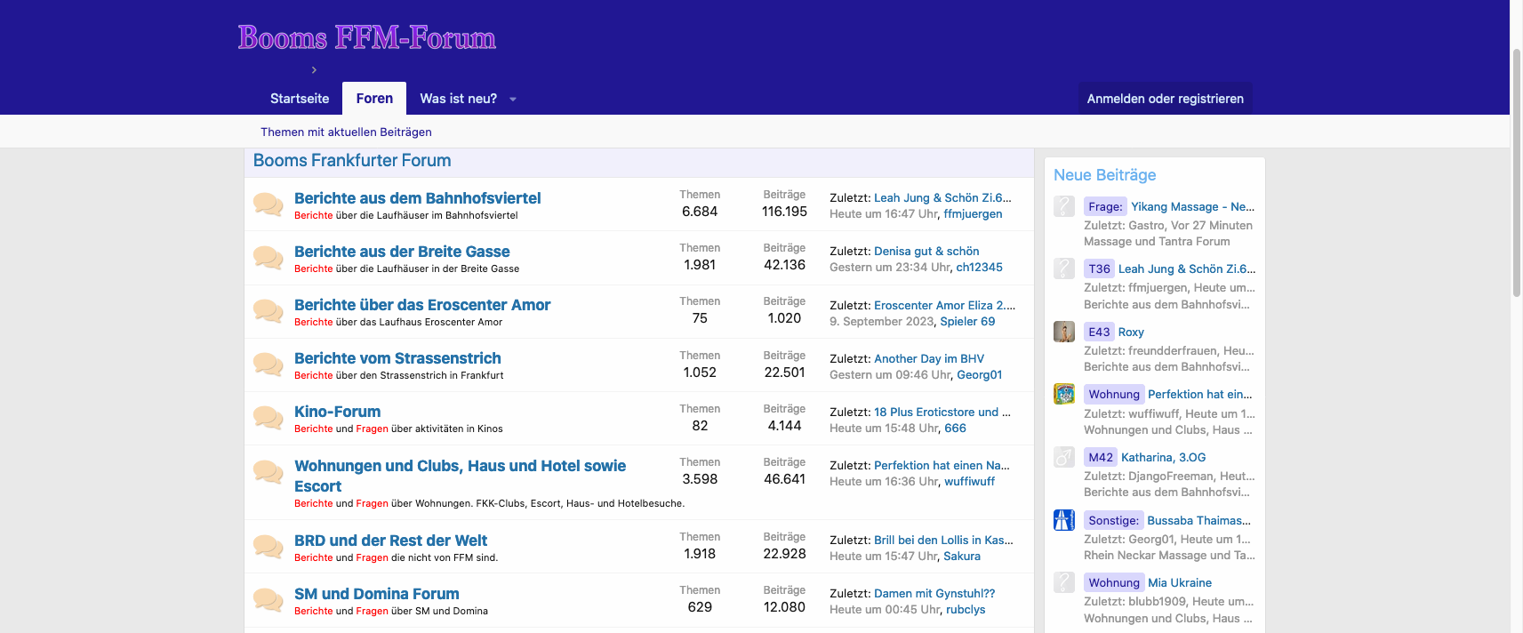 Boom and Wolfl, 2 frequent visitors to Frankfurt's brothels, compiled this page about both of Frankfurt's rlds. Maps, pics and a link to their forum. Their Frankfurt brothel forum is a prime source for most recent Frankfurt brothel reviews. It also covers sex in other Hessen areas such as Wiesbaden, Hanau and Darmstadt.