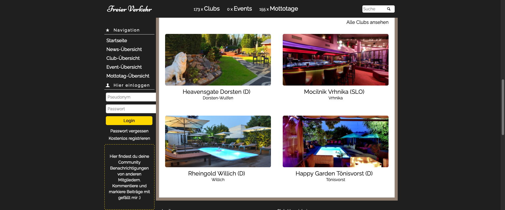 Pun was intended when creators of this website named it "free traffic" that combines to a synonyms for "Intercourse" and "Punters" as a German idiom. It's a simple one-page site showing most recent promotions and events of German bordellos, mainly FKK clubs. The entire presentation is very minimalistic.