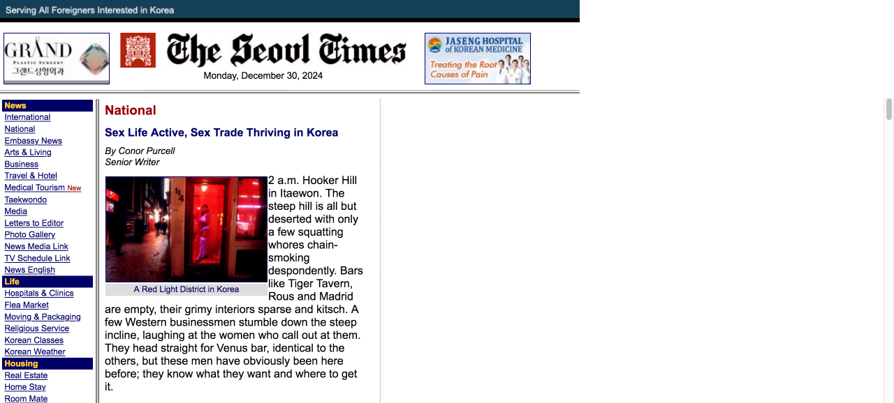 The daily press for foreigners about the Hooker Hill Itaewon red-light district. Mainstream media about prostitutes in Seoul is writing things like "squatting whores chain-smoking". There is a bit of info in there, too. Maybe not intended but it's there!