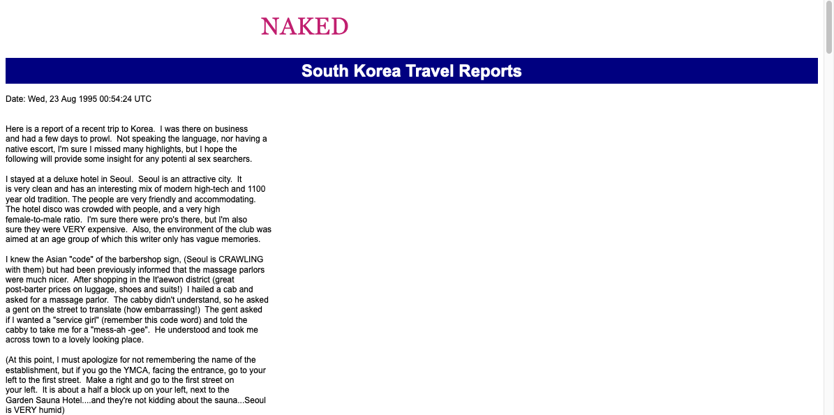 WSG Korea in Eros Korea This global discussion board contains some info about South Korea including the red light district (rld) in Yongsan with hidden camera pix and the p4p sex trade in Seoul including the infamous Miari RLD. Very dated information from World Sex Guide.Link: https://web.archive.org/web/20120503232624/http://www.worldsexguide.org/skorea_travel.txt.htmlRecent Content: No feedback yet Form is loading... This section can only be displayed by javascript enabled browsers.