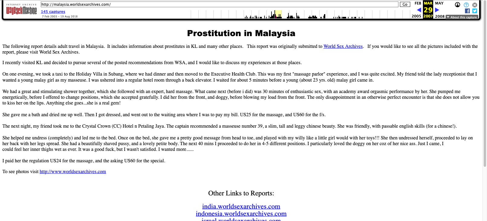 The Wordls Sex Archives used to be a forum of seasoned travelers who reported about their pay for play experiences as tourists and expats in Kuala Lumpur.