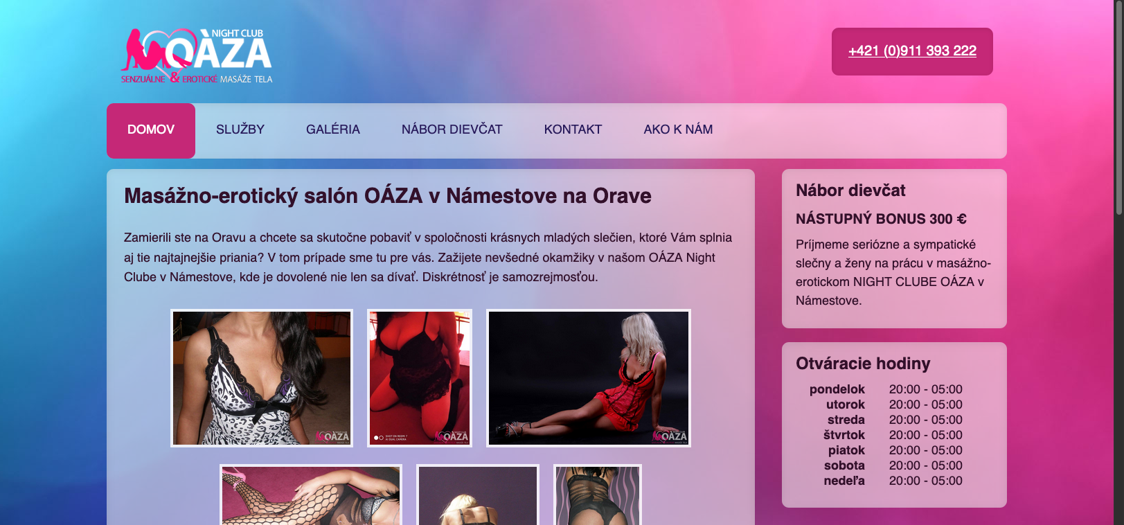 This place is hard to find. Oaza lies in the tranquil city of Namestovo near a large lake that separates Slovakia from Poland. It is surrounded by beautiful nature and landscapes. Trekking in summer, skiing in winter and Oaza nightclub in the early morning hours. Beautiful women are presented on the page's gallery.