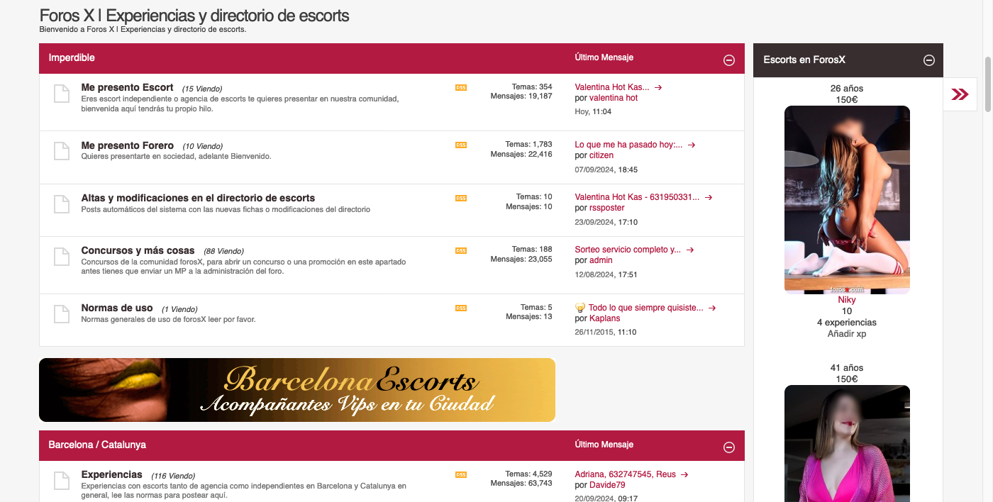Very active escort review forum has grown here. They talk about private apartments in Barcelona as much as strip clubs in Ibiza with VIP room and upscale Madrid escort models. Now, with all the recession taking place and less bankers being available to book callgirls by the hour, prices are getting very reasonable and this Foros X board is one of the best sources of information for new Spanish whores.