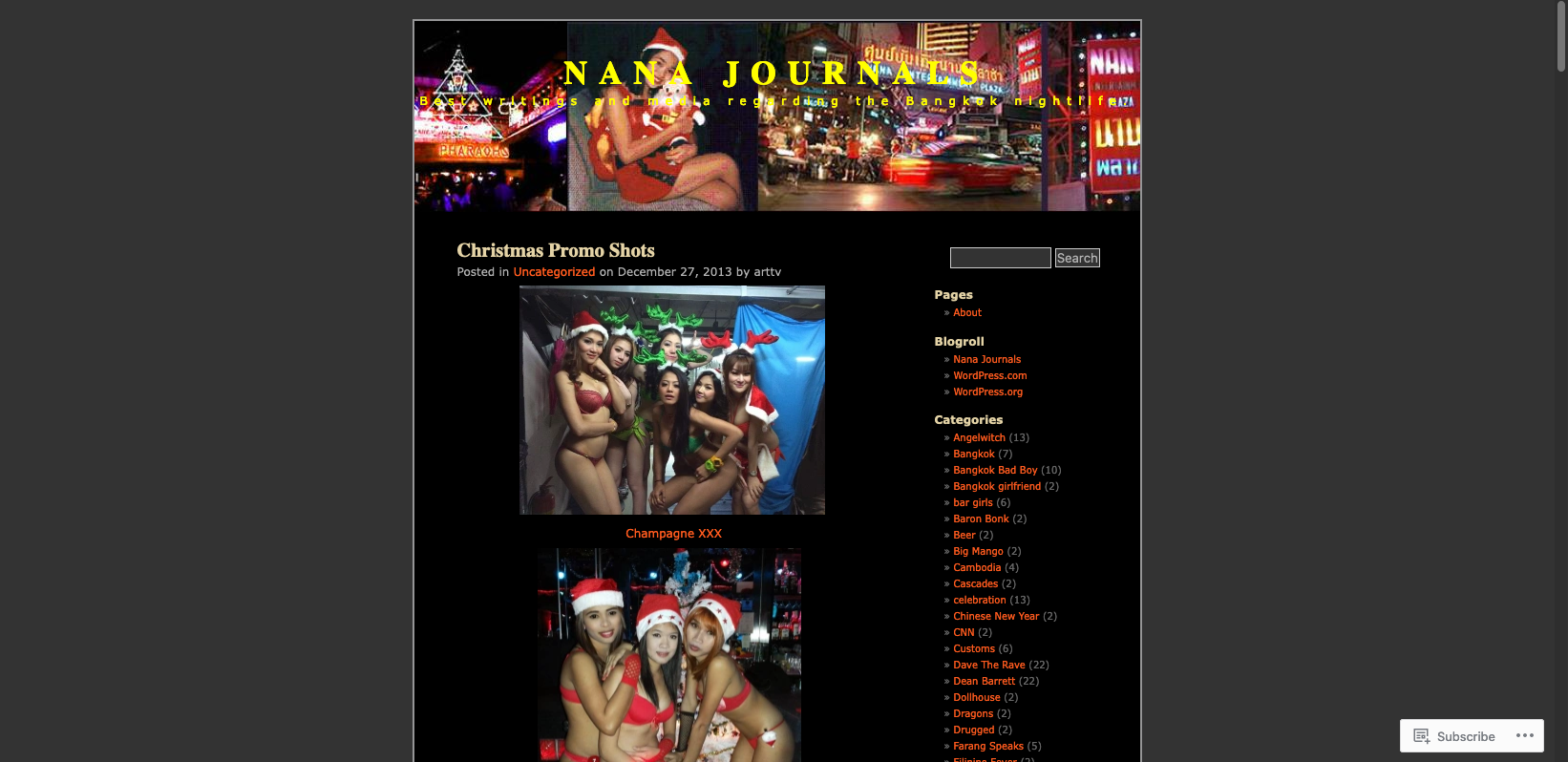 Nana Plaza is the most important bar district for horny foreigners visiting Bangkok. This fine blog is a real time documentary of a frequent visitor. His bar blog includes images of the establishments and some Thai bar girls from club Rainbow, Cascades and Porkys. Nice and informative. Updates are slow these days.