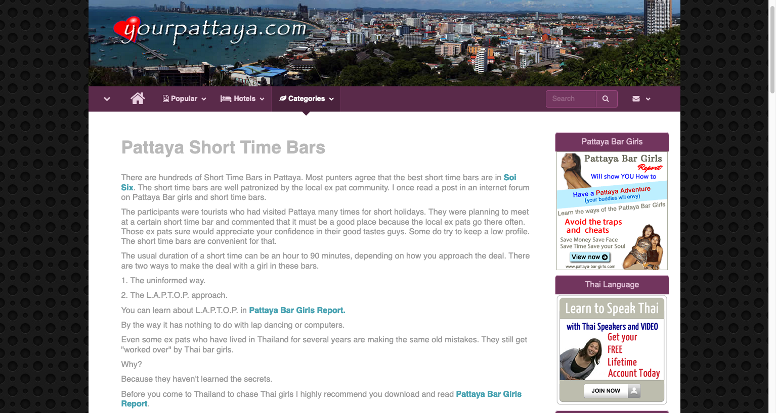 Soi 6 Bars in Pattaya The most seedy short time bars in Pattaya can be found on Soi 6. Get a drink, a blowjob and have sex upstairs for around 20 US$. The avenue is also called Soi Yodsak. Read a Pattaya Soi 6 review. Link: https://yourpattaya.com/short_time_bars.htmRecent photos: No feedback yet Form is loading... This section can only be displayed by javascript enabled browsers.